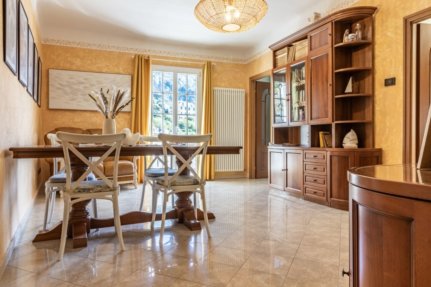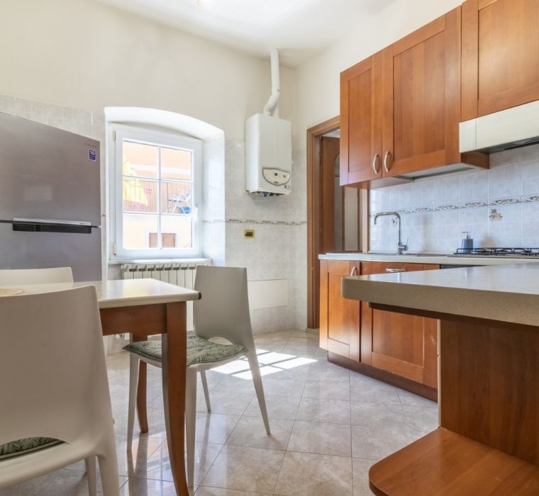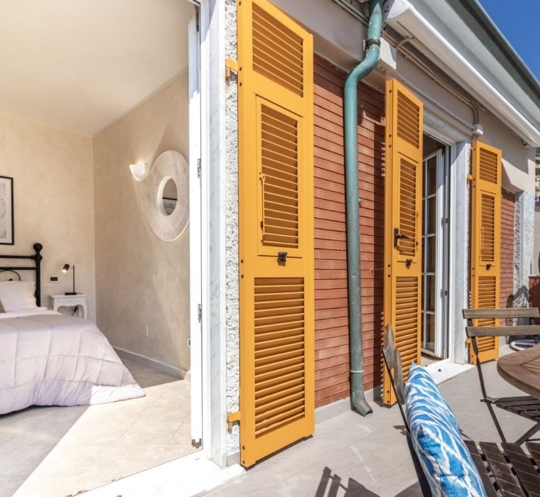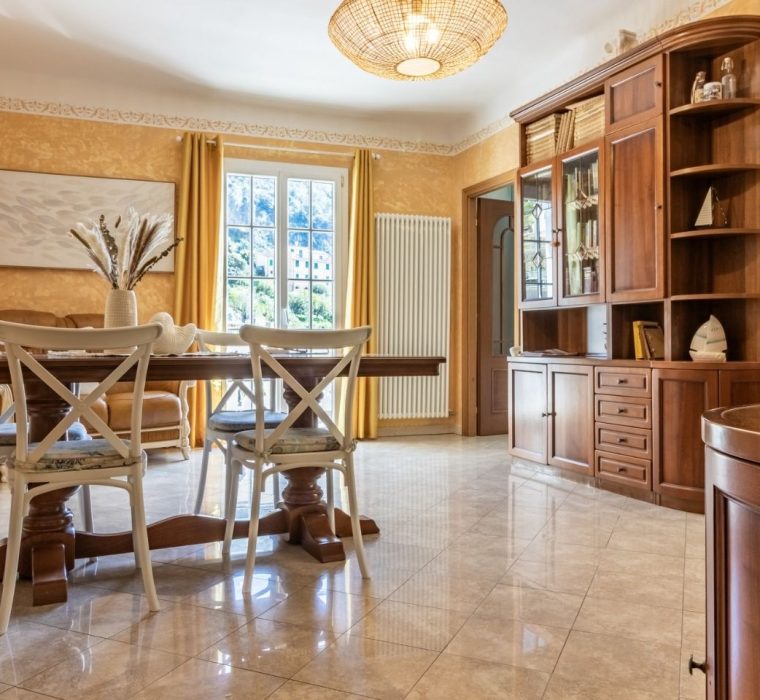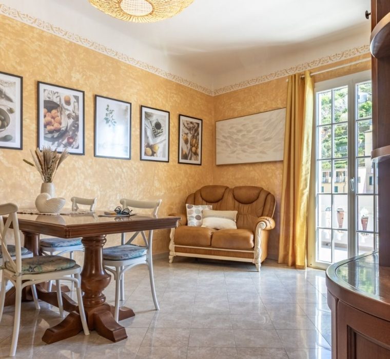 Top floor apartment with large terrace with sea view for outdoor dining with sunset view, 200 meters from the sea in the quiet central area closed to traffic. 100 sqm, 2 bedrooms , living room and kitchen, bathroom with shower. Just minutes from the station , building located in the characteristic Ligurian carrugi.